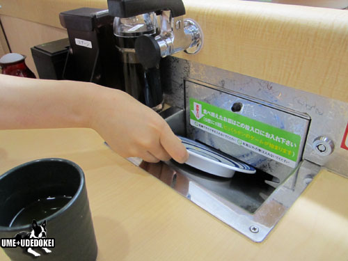 オール一皿100円の食べた後のお皿をこのダクトに入れて精算ボタンを押せばお勘定してくれます。。