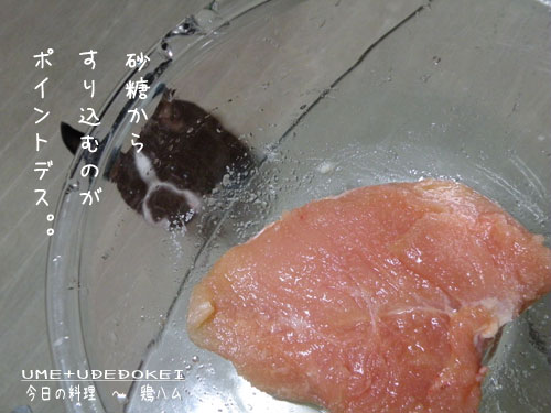 ◎砂糖と塩をすり込んだ胸肉をビニールなどに入れて密封し冷蔵庫で一晩寝かせるデス。。