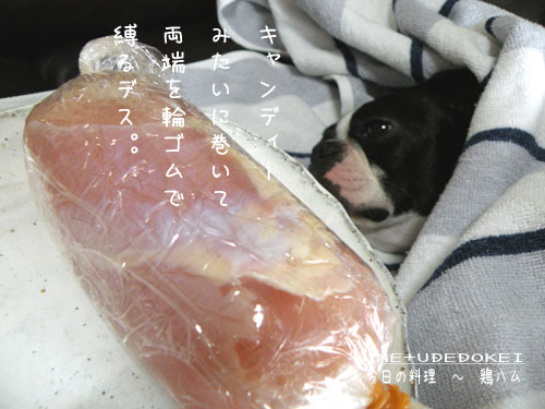 ◎塩抜きが終わった鶏肉をラップで包むデス。。