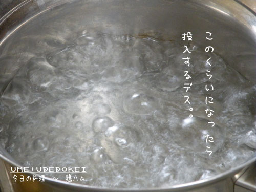 ◎鍋でお湯を沸騰させ、沸騰したお湯にラップでくるんだまま鶏肉を入れるデス。。