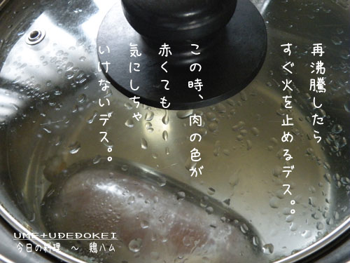 ◎鶏肉を入れて少し冷えたお湯がまたすぐに沸騰するのでここでなにも気にせず火を止めるデス。