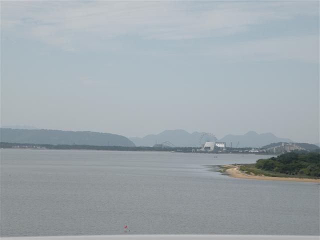 博多湾越しに見えるのが目的地の海の中道海浜公園の観覧車と